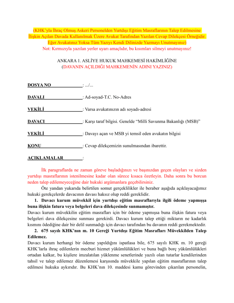 (KHK’yla İhraç Olmuş Askeri Personelden Yurtdışı Eğitim Masraflarının Talep Edilmesine İlişkin Açılan Davada Kullanılmak Üzere Avukat Tarafından Yazılan Cevap Dilekçesi Örneğidir. Eğer Avukatınız Yoksa Tüm Yazıyı Kendi Dilinizde Yazmayı Unutmayınız)