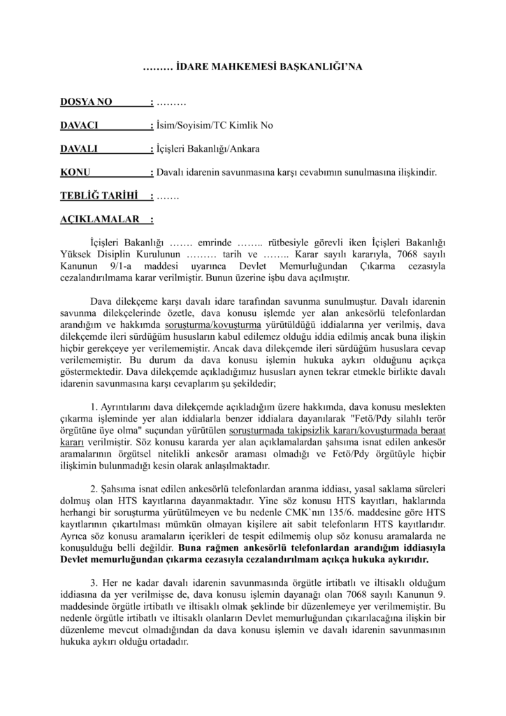 Dava dilekçeme karşı davalı idare tarafından savunma sunulmuştur. Davalı idarenin savunma dilekçelerinde özetle, dava konusu işlemde yer alan ankesörlü telefonlardan arandığım ve hakkımda soruşturma/kovuşturma yürütüldüğü iddialarına yer verilmiş, dava dilekçemde ileri sürdüğüm hususların kabul edilemez olduğu iddia edilmiş ancak buna ilişkin hiçbir gerekçeye yer verilememiştir. Ancak dava dilekçemde ileri sürdüğüm hususlara cevap verilememiştir. Bu durum da dava konusu işlemin hukuka aykırı olduğunu açıkça göstermektedir. Dava dilekçemde açıkladığımız hususları aynen tekrar etmekle birlikte davalı idarenin savunmasına karşı cevaplarım şu şekildedir;